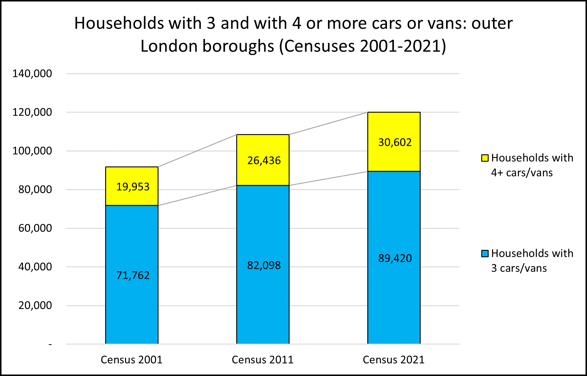 The rise in the number of vehicles per household is particularly stark in the more spacious outer London boroughs, which have more than 9,000 households with three or more cars or vans.