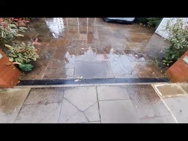 In the torrential downpours we’re increasingly experiencing, a surprisingly small blockage lets the rain run off straight off across the pavement, into the road and the road drains, as shown in the photos below: